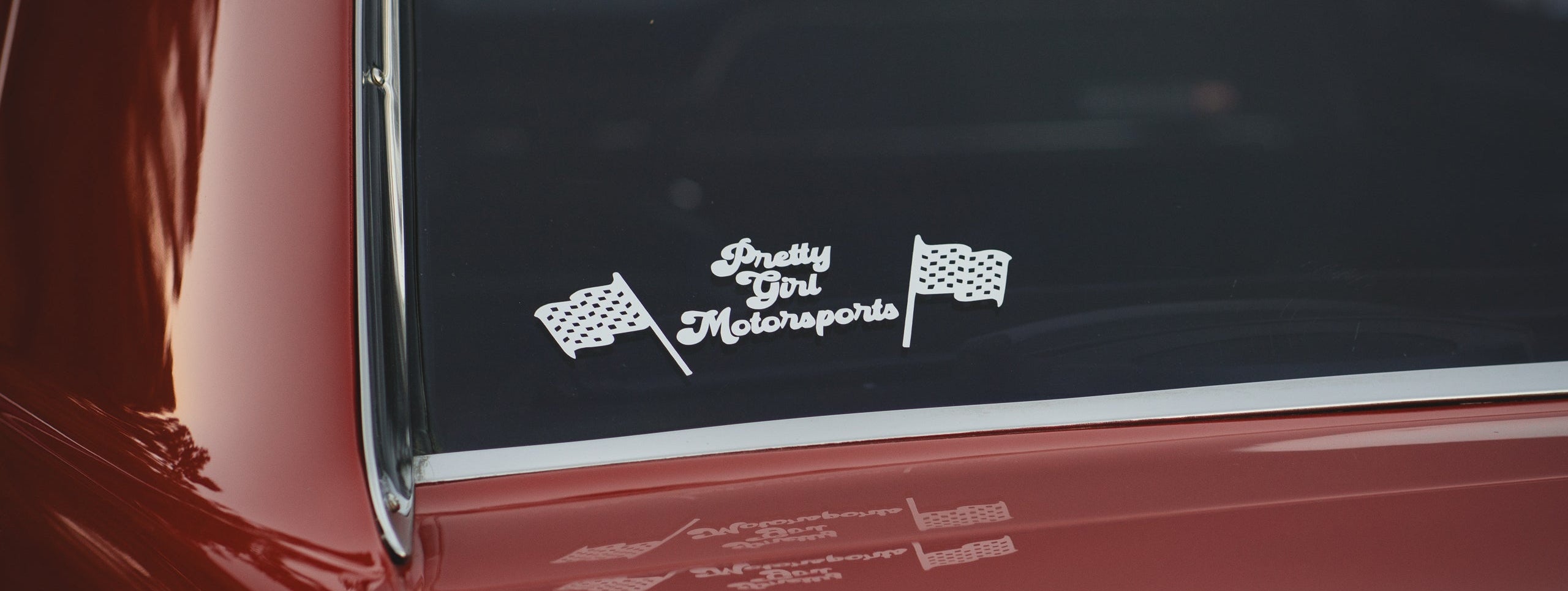 Contains words "Pretty Girl Motorsports" with two checkered flags on either side of the wording.